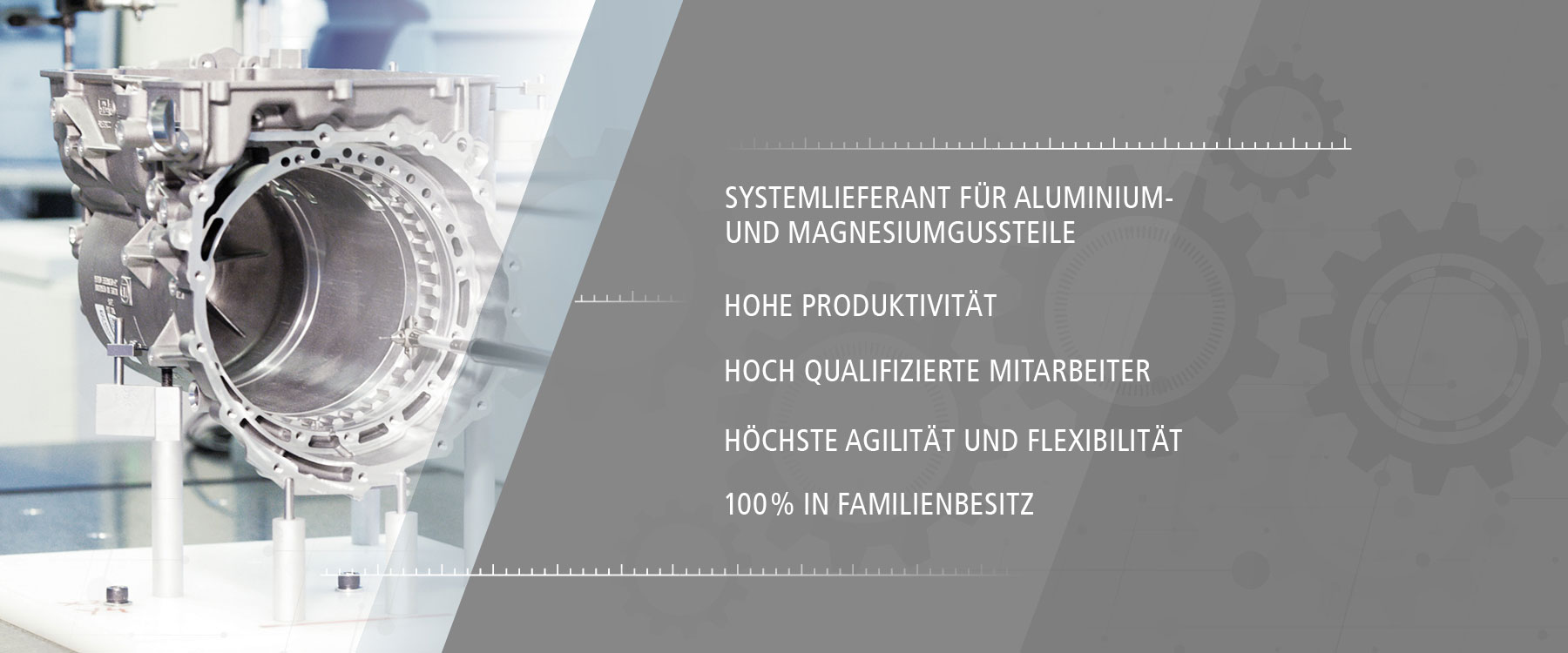Als Systemlieferant kauft Grüner projektbezogen den Guss im Markt ein und liefert das fertig bearbeitete und gegebenenfalls montierte Bauteil an den Kunden. Die komplette Prozesskette ist Kernkompetenz des Unternehmens und wird mit eigenem Know-how abgebildet – von der Entwicklung über die Konstruktion bis hin zum fertigen Bauteil. Die eigens entwickelte Bearbeitungszentren-Lösung mit der Mehrspindelkopfbearbeitung ist hochflexibel und produktiv. Neu entwickelte Zusatzmagazine für die Bearbeitungswerkzeuge ermöglichen schnellstes Umrüsten (One-Piece-Flow). Die flexible Auslegung der mechanischen Bearbeitung sowie sämtlicher Folgeprozesse ermöglicht die Produktion von unterschiedlichsten Produkten mit großer Variantenvielfalt. Durch diese spezifische Auslegung der Fertigungs- und Prüfprozesse ist die Grüner Unternehmensgruppe Benchmark bei der Bearbeitung von Aluminium- und Magnesiumgussteilen.